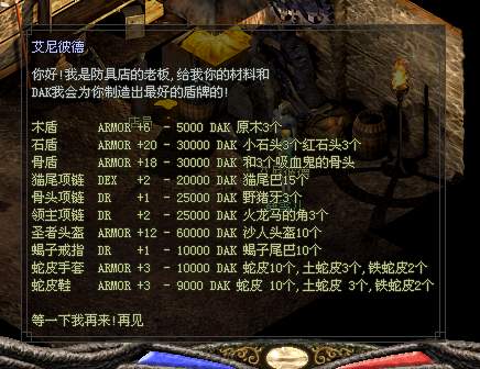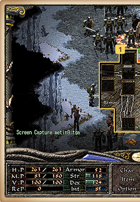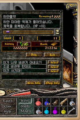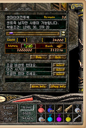 在Metin中同现实生活,可以购买生活所必需的各种物品.在每个村子的商店都可以购买,商店为NPC(Non play 角色)起商店主人的作用.移动到所购物品的商店后点击用黄色标记的NPC时会显示商品list.在商品购买窗口出现的项目如下: |