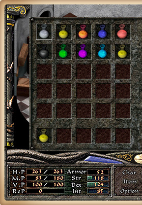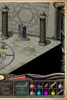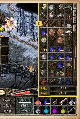 | 物品窗口中显示角色现拥有的所有物品和魔法,技术,知识等. 最初打开的窗口为物品窗口时,右边的窗口显示物品目录. 如果要让物品窗口中的某个物品成为快捷物品,只要点击该物品后移到右下角的快捷物品窗口即可解除. |